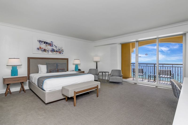 800 Sq Ft Ocean View Suite with one king bed and accessible features including roll in shower and bathroom grab bars.